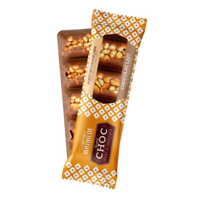 Ingredientes : Chocolate con LECHE 90% (azúcar, manteca de cacao 24%, LECHE entera en polvo 22,5%, pasta de cacao 11%, emulsionante: lecitina de SOJA, aroma natural de vainilla. Cacao: 33% minimum), AVELLANAS caramelizadas 10% (AVELLANAS, azúcar, caramelo (azúcar, agua)).