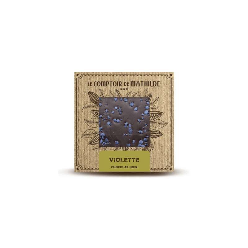Ingredientes : Chocolate negro 98,1%, (pasta de cacao, azucar, manteca de cacao, emulgente: lecitina de SOJA, aroma natural de vainilla. Cacao : 56,9% mínimo), violeta cristalisada 1,9% (azucar 96%, flores naturales 2%, agente espesante : goma arabica, colorante E120, E132).