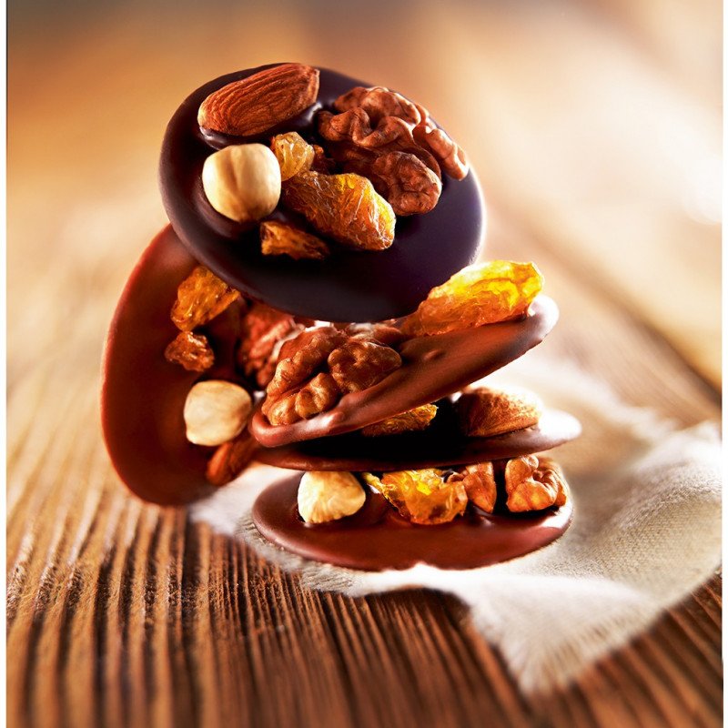 Ingredientes : Azúcar, masa de cacao, pasas 14,92%, NUECES 11%, AVELLANAS 10%, manteca de cacao, ALMENDRAS 8%, LECHE en polvo, emulgente: lecitina de SOJA, vainilla natural, aceite vegetal de colza y girasol. Chocolate negro = Cacao: 53% mínimo. Chocolate con leche = Cacao: 30% mínimo.