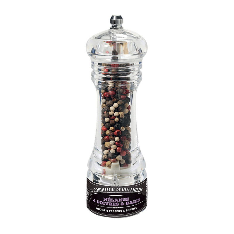 Devuelve vida a tu molino favorito con este recarga de 4 pimientas & bayas, un gran clásico para realzar todos tus platos con elegancia. Esta mezcla sutil combina fuerza, redondez y frescura, gracias a la alianza de pimienta negra, blanca, verde y bayas rosadas.