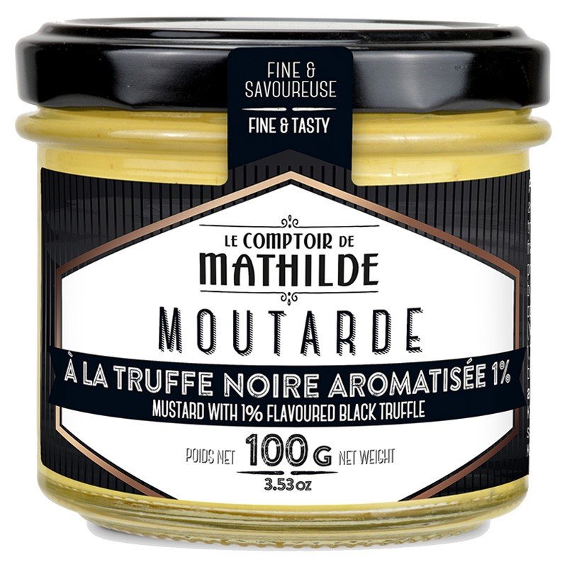 Mostaza a la Trufa Negra con sabor 1%: MOSTAZA (granos de MOSTAZA, agua, vinagre, sal, azúcar, conservante: SULFITO ácido de sodio), trufas negras trituradas 1,12% (trufas negras (Tuber melanosporum), jugo de trufa negra, agua, sal) aroma de trufa.