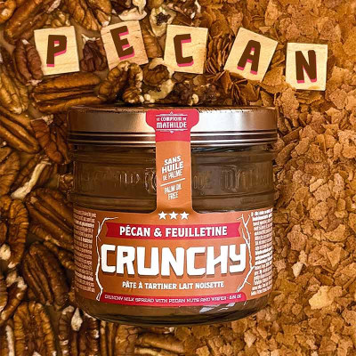 With our Crunchy Hazelnut Pecan & Feuilletine spread, enjoy twice as much crunch with every spoonful! Roasted pecans + crispy feuilletine: a unique duo that makes all the difference. Made in France, without palm oil and without GMOs, this delicious 250g recipe enhances your toast, pancakes, and sweet breaks with irresistible crunch.