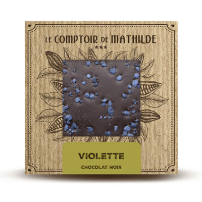 Ingredienti : Cioccolato fondente 98,1% (pasta di cacao, zucchero, burro di cacao, emulsionante: lecitina di SOIA, aroma naturale di vaniglia. Cacao : 56,9% min.) violetta cristallizzata 1,9% (zucchero 96%, fiori naturali 2%, agente addensante: gomma arabica, aroma, coloranti: E120, E132).