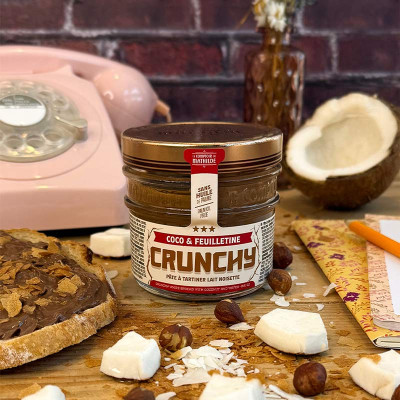 Abbandonati all'equilibrio perfetto tra cremosità e croccantezza con il nostro cioccolato spalmabile Crunchy Latte Nocciola Cocco & Feuilletine. Una base fondente al latte nocciola incontra la croccantezza irresistibile delle scaglie di cocco e della feuilletine.
