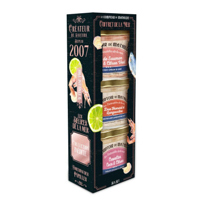 Ingredienti : Preparazione a base di salmone y salmone affumicato, panna e lime : SALMONE e SALMONE affumicato 50%, CREME fraîche 37,5%, MOSTARDA (acqua, semi di SENAPE, aceto di alcol, sale), erba cipollina, fibre vegetali (grano, lino, agrumi), zucchero, scorza di lime 1%, succo concentrato di lime 0,8%, sale di Guérande, spezie, erbe aromatiche.