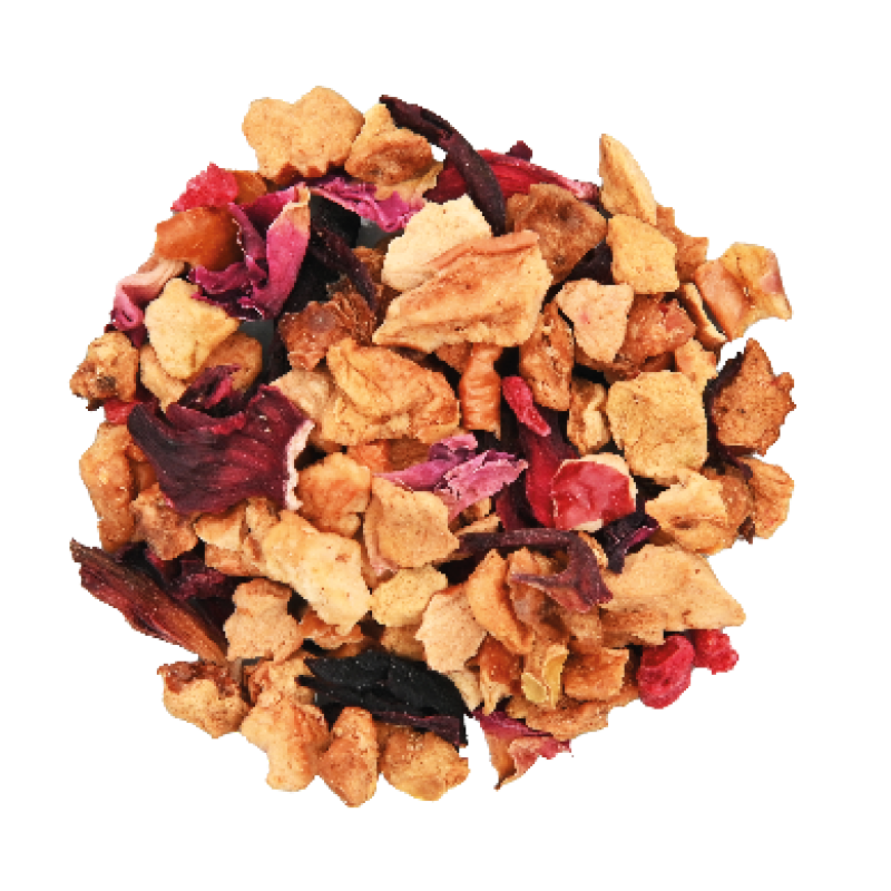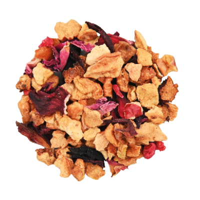 Ingredienti : Pezzi di mela, ibisco, aroma, pezzi di lampone 2%, petali di rosa, aroma pompelmo 1%.