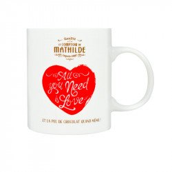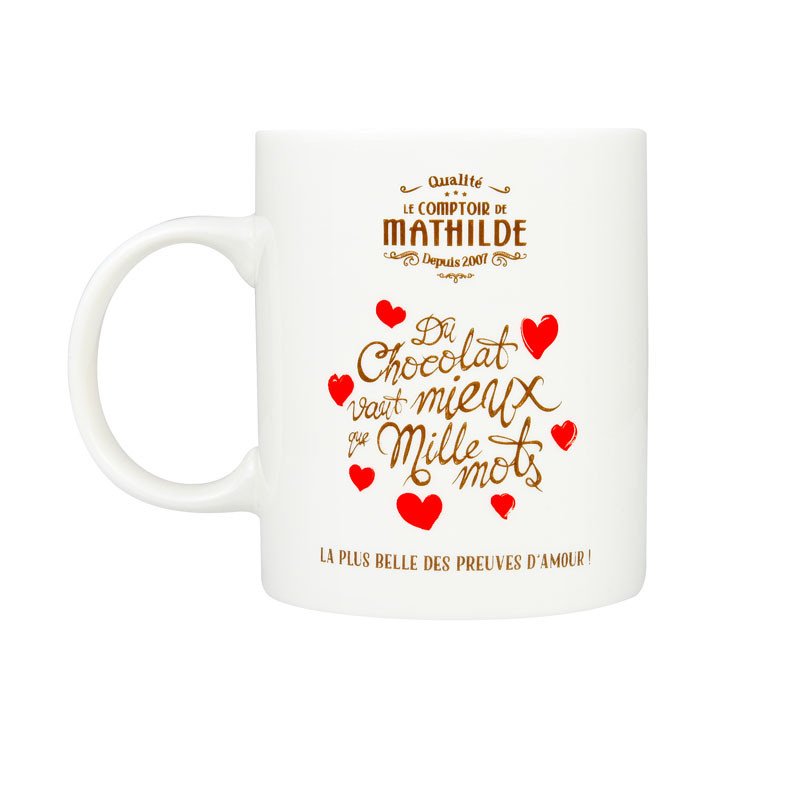 Laat je verleiden door deze mok "Mathilde Love", een teder ontwerp van Le Comptoir de Mathilde. Versierd met een lief bericht, begeleidt het je ontspanningsmomenten met een goede warme chocolademelk of een dampende thee.
